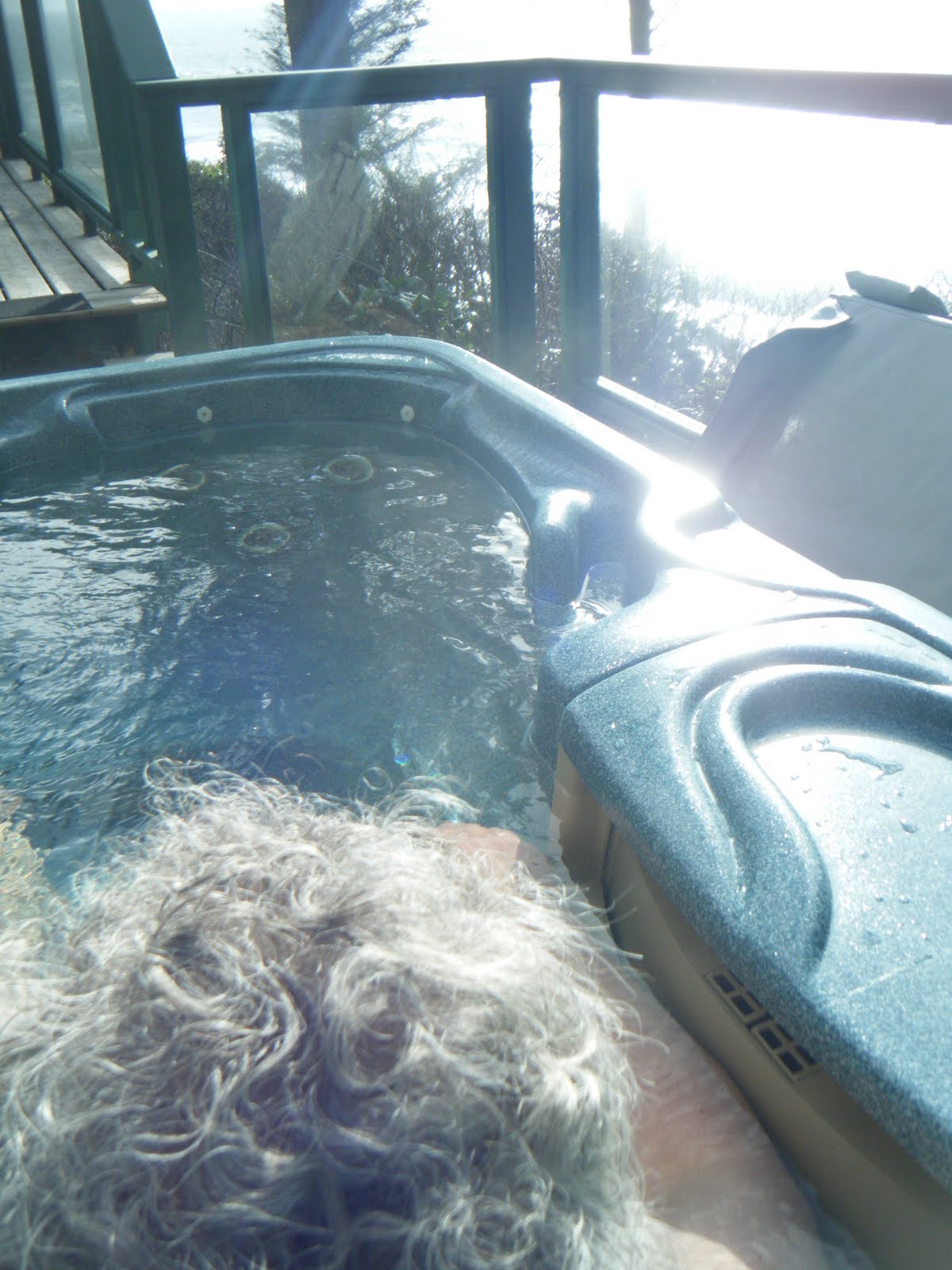 Day One evening – We have made use of the hot tub.... both late afternoon and now after 7pm – in the pitch black of night. The first time was spitting rain and mist, the second started as no rain , but the rain came on. The first we watched from a distance “two ships passing in the night” – ok it wasn’t night – and at night, just listened to the wind blustering through the trees, happy that the house was protection from the winds for us going to and from the hot tub.